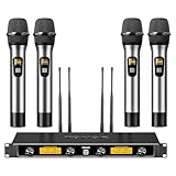 - BEYOND-EXPECTATION WIRELESS PERFORMANCE: 4-channel UHF microfono inalambrico set features fixed frequencies at 541.9 MHz, 546.3 MHz, 561.6 MHz, and 568.65 MHz, ensuring an ultra-stable signal and eliminating unwanted distortion. The professional microphone receiver features an LCD screen that displays frequency and has individual volume controls for precise vocal balancing. Enjoy up-to-260 ft freedom of movement compared to wired mics
