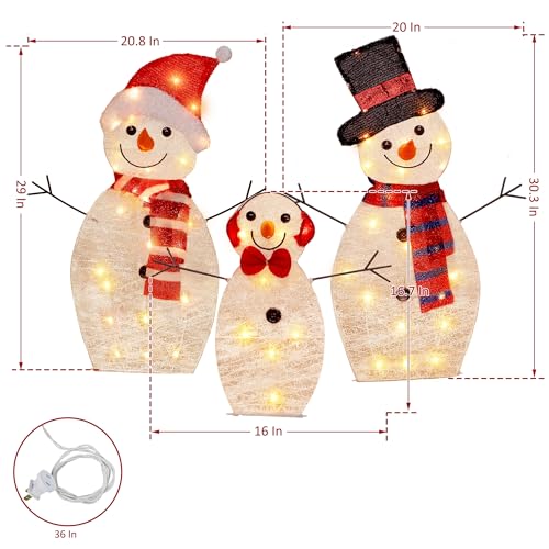 The adorable design of these snowmen is sure to put a smile on anyone s face! The father and mother both wear striped scarves and either red Christmas hats or black top hats while the baby wears bow ties and ear protection. This cute snowman family will be a great addition to any Christmas display!