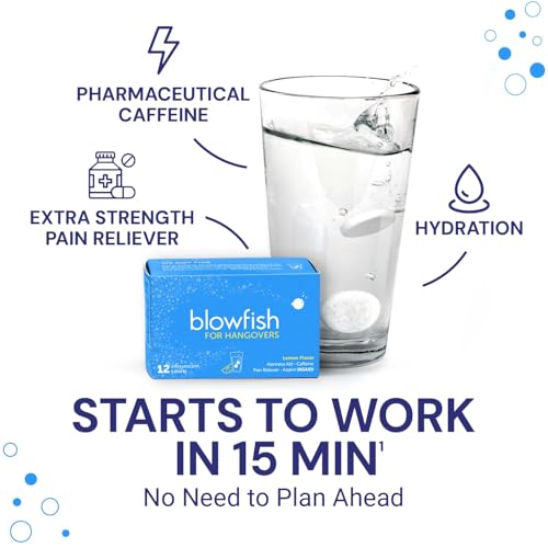 The first thing I noticed about Blowfish is its convenient form factor it comes in easy to use tablets that you drop into water to make a refreshing lemony drink. This makes it much more convenient than other so called preventatives which need to be taken before drinking. It also works faster because the effervescent delivery method gets the medicine into your system twice as quickly as pills. The maximum strength aspirin in Blowfish eases the pain of the hangover headache, while pharmaceutical caffeine helps relieve hangover symptoms and increases the effectiveness of pain relievers without upsetting your stomach like coffee can do.