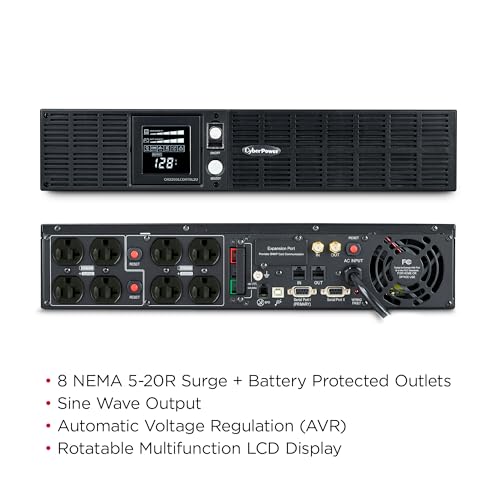 The system comes with eight battery backup and surge protected outlets two NEMA 5 20R outlets, six NEMA 5 15R outlets, and a NEMA 5 20P right angle, 45 degree offset plug with 10 foot power cord. It also has an automatic voltage regulation AVR feature that corrects minor power fluctuations without switching to battery power, thereby extending the battery life. It also has a rotatable multi function LCD panel that displays immediate, detailed information of battery and power conditions like estimated runtime, battery capacity, load capacity etc.