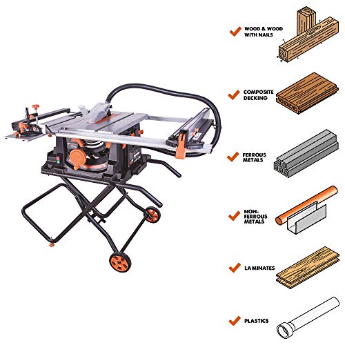 What really sets this table saw apart is its extra safety features the included push stick offers safer operation when handling offcuts and there are left and right table extensions to support wide work pieces up to 47 1/4 x 25 3/16 inches in size. Moreover, it has a collapsible frame with wheels for easy storage and portability meaning there is no need for use of a miter saw stand, which is always handy when you re working in tight spaces.