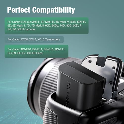 The charger features a 2600mAh 7.4 V Premium Lithium ion no memory effects, which means it will store more energy than other standard chargers and can be used for multiple sessions without having to recharge. Its also certified by CE, FCC, PSE, and ROHS safety standards, so you can be sure that your battery is safe from overcharging, short circuits, and other potential hazards. Additionally, the charger is compatible with a variety of Canon cameras such as the 5D Mark II, 5D Mark III, 5D Mark IV, 5DS, 5DS R, 6D, 6D Mark II, 7D, 7D Mark II, 60D, 60Da, 70D, 80D, 90D , R , R5 , R6 , XC10 and XC15 cameras.