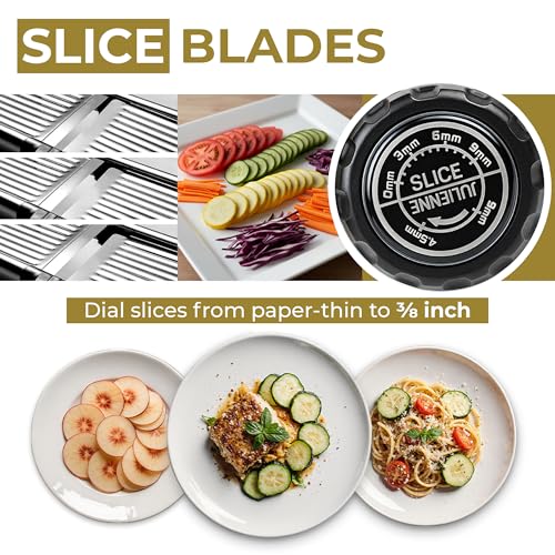 The blade on this slicer is made out of top grade 4CR15 stainless steel, so it wont chip, dull, or bend easily. Plus, the adjustable blade dial allows you to quickly switch between different slicing options without having to touch the blade. You can slice from extremely thin to 9mm thick with two julienne settings 4.5mm and 9mm. The body of this slicer is also professional quality with easy to clean surgical stainless steel, making it durable and long lasting.