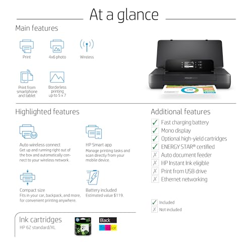 | included components | HP OfficeJet 200 Mobile Printer, Setup Poster, SW CD, HP 62 Tricolor Ink Cartridge 165 pages , HP 62 Black Ink Cartridge 200 pages |