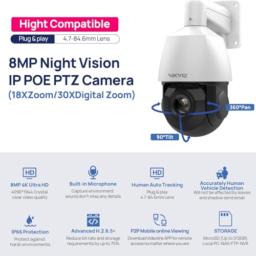 The VIKVIZ 4818X IZ Auto Tracking PTZ Speed Dome Camera also supports Power over Ethernet PoE which makes it easy to install and eliminates the need for additional wiring. It s also IP66 weather proof so it can handle whatever Mother Nature throws at it. Additionally, this camera is compatible with Hikvision NVRs and Onvif protocol, allowing you to plug and play with any system you have.