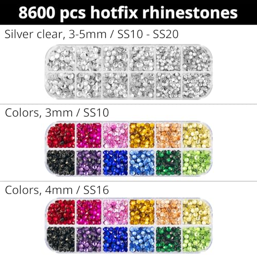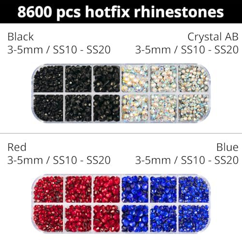 This kit comes with an abundance of high quality hotfix rhinestones. Five boxes of hotfixed rhinestones let you complete several projects worry free. Bigger hot fix rhinestones help your projects to shine more and take less time to finish. Premium hot fix rhinestones in Crystal AB color give your project a touch of extra sparkle.