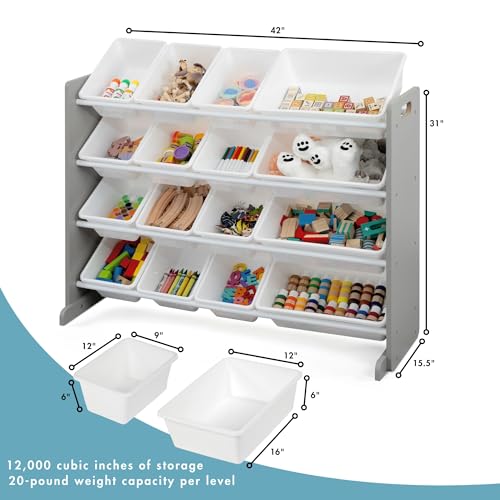 The Humble Crew Supersized Toy Storage Organizer is made from wood, plastic and metal, making it extremely sturdy and durable. The large size of the organizer allows for 25 more storage than other top organizers on the market. It also comes with 12 standard size open storage plastic bins and 4 double size open storage plastic bins, which makes it great for storing toys of all sizes. The bins are removable, making them perfect for both playtime and cleanup.