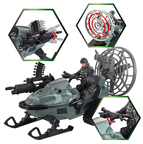 The fighter jet has some really great features that make it look realistic. Soldiers can sit in the cockpit of the fighter jet, and the missiles on both sides are detachable. There are landing gear wheels on the bottom of the fighter that can be used to fix the aircraft in place. The handle and machine gun on the snowmobile are movable, and the fan at the tail also can be turned. The men figures have movable joints that can make various poses and hold the equipment.