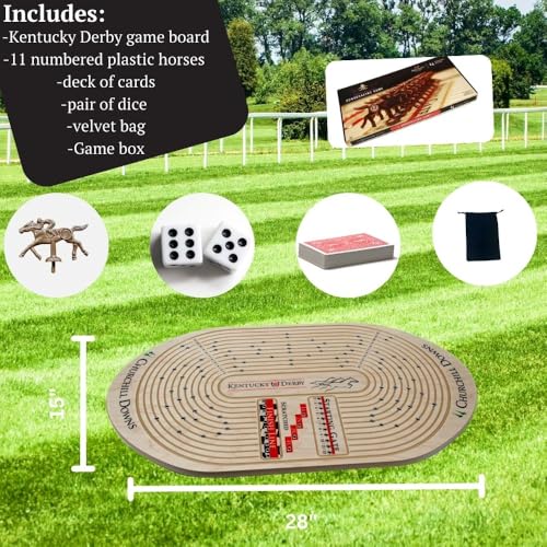 If you re looking for a classic board game to enjoy with family and friends, the Across The Board Churchill Downs Horse Racing Game is an excellent choice. This licensed Kentucky Derby Churchill Downs game is an engaging strategy game that s easy to learn, yet challenging to master. It features a realistic oval shaped track printed on a maple veneer game board and 11 durable plastic/rubber composite horses.