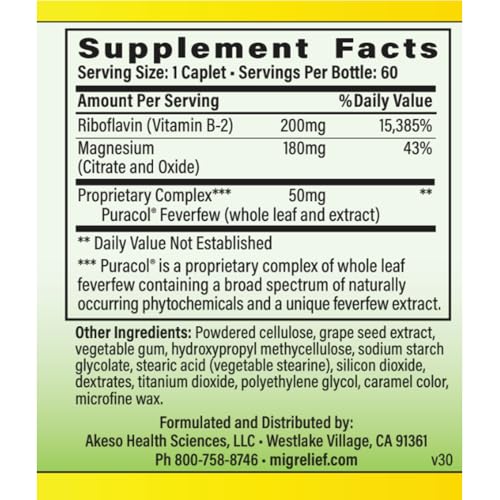 MigreLief is non prescription, vegetarian, drug free, caffeine free and non GMO. It does not contain butterbur, wheat, gluten, salt, soy, milk or dairy, nuts, corn, caffeine, artificial flavorings or preservatives. The ingredients are tested by independent 3rd party laboratories, and manufactured in certified facilities in the United States. This product comes in a bottle containing 60 caplets with a weight of 0.22 pounds.