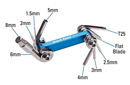 The tool comes with 1.5, 2, 2.5, 3, 4, 5, 6 and 8mm allen wrenches and a T25 Torx head and flathead screwdriver. This makes it an extremely versatile tool that can be used for a variety of tasks. Whats more, it folds neatly into a compact shape so that you can store it easily in your pocket.