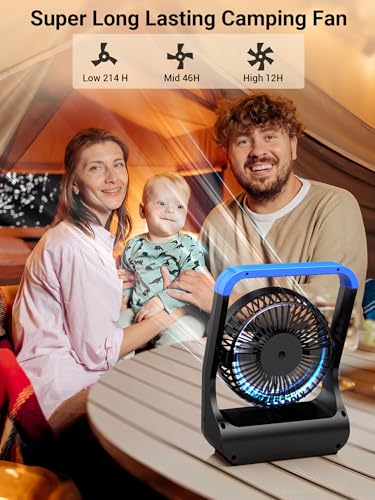 The battery operated fan is an ideal solution for camping trips or power outages when you need to stay cool and comfortable. It runs off four D cell batteries not included and offers three different settings: low, medium, and high. On low speed, the fan can last for up to 214 hours, 46 hours on medium speed, and 14 hours on high speed making it perfect for extended outdoor use. The 180 rotation design means you can take the fresh air directly to your face no matter where you are located. Plus, thanks to its convenient handle, you can easily carry this fan around from place to place.