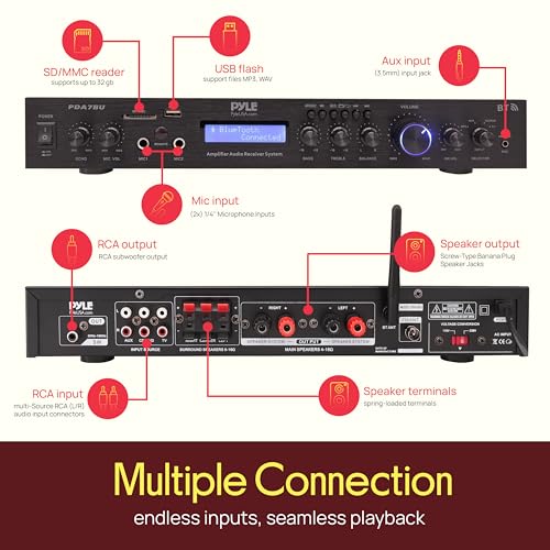 The Pyle 5 Channel Rack Mount Bluetooth Receiver is compatible with all types of devices such as smartphones, tablets, and speakers. It has a wireless range of 30 plus and you can easily stream music from your device to your speakers using Bluetooth 2.1 technology. It also comes equipped with USB flash and SD memory card readers, as well as a 3.5mm aux input jack and multi source RCA audio input connectors so you can easily connect external devices such as CD players or MP3s players.
