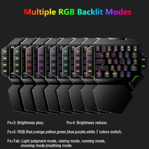 The keyboard has a variety of RGB backlit modes that can be activated by pressing the FN 3,4,5, and Tab keys. These modes include brightness plus/reduce, 7 color switch, light judgment mode, raising mode, running mode, snowing mode, and breathing mode. The seven color switch allows you to choose from red, orange, yellow, green, blue, purple and white colors. With these modes you can customize your gaming experience.