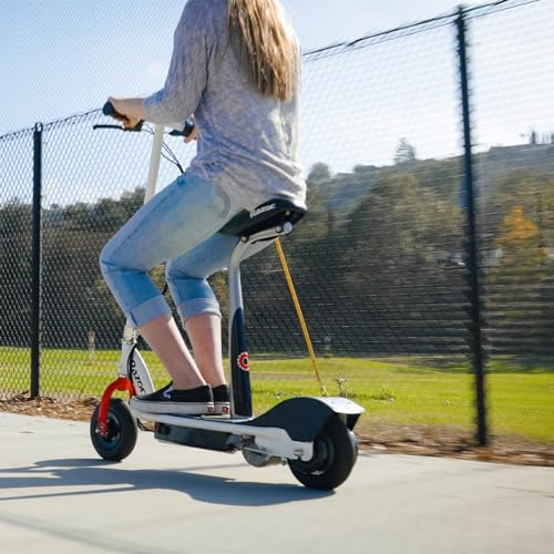 The Razor E200S Seated Electric Scooter is designed for teens and adults alike. The adjustable handlebar allows users of all heights to ride comfortably while the 8 inch pneumatic tires provide a smooth ride. The removable riding seat provides an extra level of comfort and the spring loaded kickstand makes it easy to park when not in use.