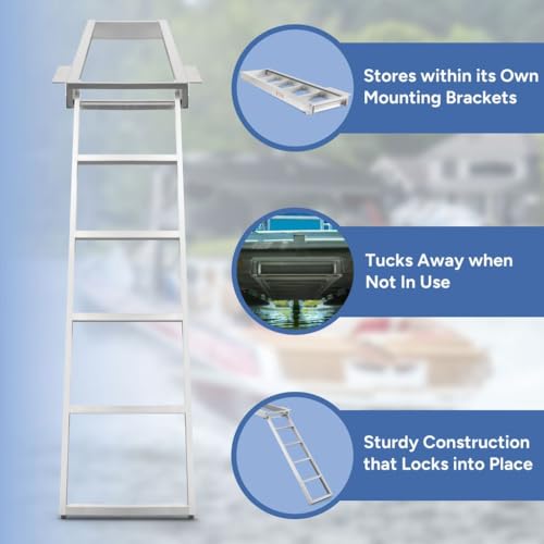 The RecPro Marine Pontoon Boat Extra Long Under Deck Mount Self Storing Ladder is an excellent choice for anyone looking for an easy to use, safe, and secure way to board their pontoon boat. After installation, the ladder slides out easily from beneath the deck of your pontoon boat and can be locked in place with a latch for added security while in use. The ladder also has five steps making it extremely easy to board your vessel without having to strain or climb awkwardly.