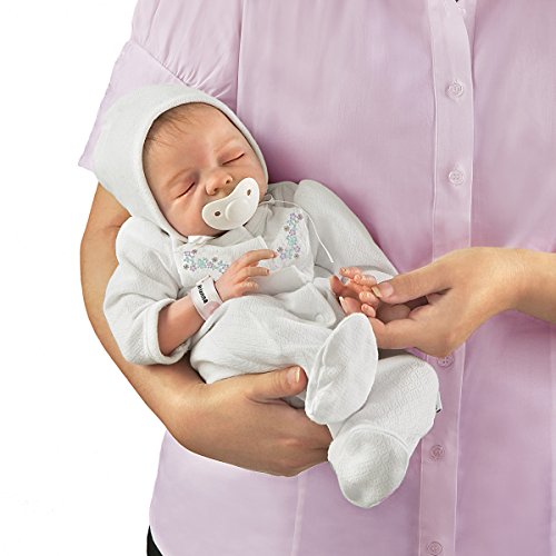 The Ashton Drake Galleries So Truly Real Lifelike, Realistic Newborn Baby Doll 18 inches is the perfect gift for a special someone. Whether it s a young child s first doll or a collector s latest addition, this item will be cherished for years to come. The doll is crafted from high quality materials and features realistic details that make it feel like a real baby. It has RealTouch vinyl skin that is incredibly soft and lifelike, a weighted cloth body that feels like the real thing in your arms, and hand applied hair that looks and feels natural. Its wispy eyelashes, tiny hand painted fingernails and toenails give it an extra dose of realism. The doll also comes with with a footed sleeper with a matching cap, plus a FREE pacifier and a hospital bracelet you can personalize when you choose her name!