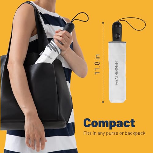 The Weatherman Travel Windproof Compact Umbrella is designed to withstand winds up to 45mph, making it a great option for those who live in windy areas or for travelers who may encounter different weather conditions on their trips. Its also very strong and resistant to drops, falls, breaking and inverting making sure you stay dry even when the weather takes a turn for the worst.